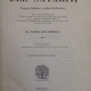 HISTORIA DEL NAYARIT, SONORA, SINALOA Y AMBAS CALIFORNIAS. QUE CON EL TITULO DE «APOSTOLICOS AFANES DE LA COMPAÑIA DE JESUS, EN LA AMERICA SEPTENTRIONAL» SE PUBLICO ANONIMA EN BARCELONA EL AÑO DE 1754. SIENDO SU AUTOR EL PADRE JOSE ORTEGA. NUEVA EDICION, AUMENTADA CON UN PROLOGO ESCRITO POR EL SR. LIC. MANUEL DE OLAGUIBEL