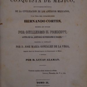 HISTORIA DE LA CONQUISTA DE MEJICO, CON UN BOSQUEJO PRELIMINAR DE LA CIVILIZACION DE LOS ANTIGUOS MEJICANOS, Y LA VIDA DEL CONQUISTADOR HERNANDO CORTES, ESCRITA EN INGLES POR GUILLERMO H. PRESCOTT, AUTOR DE LA ,,HISTORIA DE FERNANDO E ISABEL». TRADUCIDA AL CASTELLANO POR D. JOSE MARIA GONZALEZ DE LA VEGA. SEGUNDO FISCAL DEL TRIBUNAL SUPERIOR DEL DEPARTAMENTO DE MEJICO. Y NOTADA POR D. LUCAS ALAMAN. TOMO I