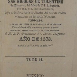 HISTORIA DE LA PROVINCIA DE SAN NICOLAS DE TOLENTINO DE MICHOACAN, DEL ORDEN DE N. P. S. AGUSTIN POR EL P. M. F. DIEGO BASALENQUE, HIJO DE LA PROVINCIA DE MEXICO DEL MISMO ORDEN Y ASISTENTE EN LA DE MICHOACAN. DEDICADA A LA MISMA PROVINCIA DE SAN NICOLAS DE TOLENTINO HIZOSE EL AÑO DE MIL Y SEISCIENTOS Y CUARENTA Y CUATRO. IMPRIMIOSE, SIENDO PROVINCIAL EN DICHA PROVINCIA EL M. R. P. PRESENTADO FR. SIMON SALGUERO. AÑOS DE 1673. TOMO II