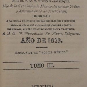 HISTORIA DE LA PROVINCIA DE SAN NICOLAS DE TOLENTINO DE MICHOACAN, DEL ORDEN DE N. P. S. AGUSTIN POR EL P. M. F. DIEGO BASALENQUE, HIJO DE LA PROVINCIA DE MEXICO DEL MISMO ORDEN Y ASISTENTE EN LA DE MICHOACAN. DEDICADA A LA MISMA PROVINCIA DE SAN NICOLAS DE TOLENTINO HIZOSE EL AÑO DE MIL Y SEISCIENTOS Y CUARENTA Y CUATRO. IMPRIMIOSE, SIENDO PROVINCIAL EN DICHA PROVINCIA EL M. R. P. PRESENTADO FR. SIMON SALGUERO. AÑOS DE 1673. TOMO III