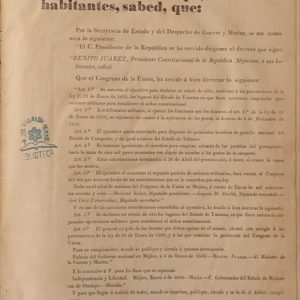 EL C. JUSTO MENDOZA GOBERNADOR DEL ESTADO DE OCAMPO, A TODOS SUS HABITANTES SABED QUE: (COMUNICADOS OFICIALES DEL GOBIERNO DEL ESTADO, PUBLICACIONES DEL DIARIO OFICIAL, NOVIEMBRE DE 1867 – OCTUBRE DE 1869)