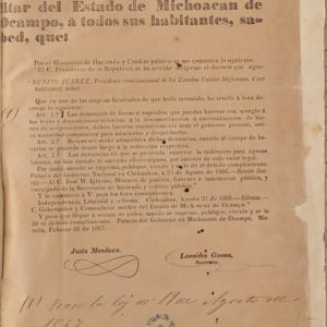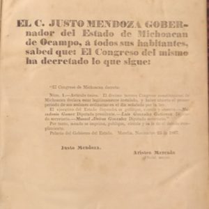 EL C. JUSTO MENDOZA, GOBERNADOR Y COMANDANTE MILITAR DEL ESTADO DE MICHOACAN DE OCAMPO, A TODOS SUS HABITANTES SABED QUE: (COMUNICADOS OFICIALES DEL GOBIERNO DEL ESTADO, PUBLICACIONES DEL DIARIO OFICIAL, FEBRERO DE 1867 – ENERO DE 1870)