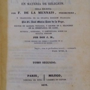 ENSAYO SOBRE LA INDIFERENCIA EN MATERIA DE RELIGION. OBRA ESCRITA POR F. DE LA MENNAIS. TOMO SEGUNDO