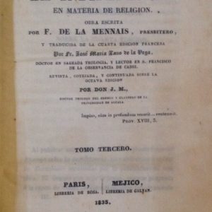 ENSAYO SOBRE LA INDIFERENCIA EN MATERIA DE RELIGION. OBRA ESCRITA POR F. DE LA MENNAIS. TOMO TERCERO