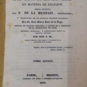 ENSAYO SOBRE LA INDIFERENCIA EN MATERIA DE RELIGION. OBRA ESCRITA POR F. DE LA MENNAIS. TOMO QUINTO