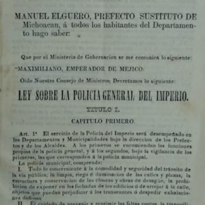 MANUEL ELGUERO, PREFECTO SUSTITUTO DE MICHOACAN, A TODOS LOS HABITANTES DEL DEPARTAMENTO HAGO SABER: QUE POR EL MINISTERIO DE GOBERNACION SE ME COMUNICA LO SIGUIENTE: MAXIMILIANO, EMPERADOR DE MEJICO: OIDO NUESTRO CONSEJO DE MINISTROS; DECRETAMOS LO SIGUIENTE: LEY SOBRE LA POLITICA GENERAL DEL IMPERIO.