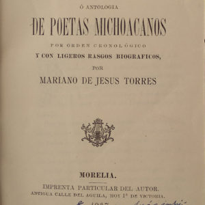 PARNASO MICHOACANO O ANTOLOGIA DE POETAS MICHOACANOS POR ORDEN CRONOLOGICO Y CON LIGEROS RASGOS BIOGRAFICOS, MARIANO DE JESUS TORRES