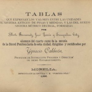 TABLAS QUE EXPRESAN LOS VALORES ENTRE LAS UNIDADES DEL SISTEMA ANTIGUO DE PESAS Y MEDIDAS, Y LAS DEL NUEVO SISTEMA METRICO DECIMAL, FORMADAS. ALBERTO BREMOUNTZ, JOSE GARCIA Y TRANQUILINO ORTIZ. ALUMNOS DEL CUARTO CURSO DE LA ESCUELA DE LA CARCEL PENITENCIARIA DE ESTA CIUDAD, DIRIGIDAS Y RECTIFICADAS POR YGNACIO CALDERON