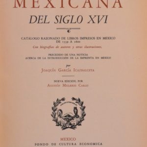 BIBLIOGRAFIA MEXICANA DEL SIGLO XVI. CATALOGO RAZONADO DE LIBROS IMPRESOS EN MEXICO DE 1539 A 1600. CON BIOGRAFIAS DE AUTORAS Y OTRAS ILUSTRACIONES, PRECEDIDO DE UNA NOTICIA ACERCA DE LA INTRODUCCION DE LA IMPRENTA EN MEXICO.
