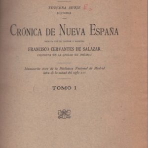 PAPELES DE NUEVA ESPAÑA. COMPILADOS Y PUBLICADOS POR FRANCISCO DEL PASO Y TRONCOSO. TERCERA SERIE. HISTORIA. CRONICA DE NUEVA ESPAÑA. ESCRITA POR EL DOCTOR Y MAESTRO FRANCISCO CERVANTES DE SALAZAR CRONISTA DE LA CIUDAD DE MEXICO. MANUSCRITO 2011 DE LA BIBLIOTECA NACIONAL DE MADRID LETRA DE LA MITAD DEL SIGLO XVI. TOMO I