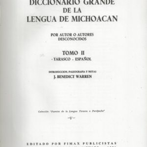 DICCIONARIO GRANDE DE LA LENGUA DE MICHOACAN. POR AUTORES DESCONOCIDOS. TOMO II. ESPAÑOL – TARASCO. INTRODUCCION, PALEOGRAFIA Y NOTAS J. BENEDICT WARREN