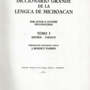 DICCIONARIO GRANDE DE LA LENGUA DE MICHOACAN. POR AUTORES DESCONOCIDOS. TOMO I. ESPAÑOL – TARASCO. INTRODUCCION, PALEOGRAFIA Y NOTAS J. BENEDICT WARREN
