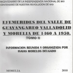 FOLLETOS DE LA HISTORIA DE MORELIA No. 12. PARA CONMEMORAR EL: BICENTENARIO DE LA CONJURACION DE VALLADOLIDDE 1809. BICENTENARIO DE LA INDEPENDENCIA NACIONAL DE 1810. CENTENARIO DE NUESTRA REVOLUCION DE 1910. EFEMERIDES DEL VALLE DE GUAYANGAREO VALLADOLID Y MORELIA DE 1460 A 1950. TOMO II