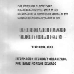 FOLLETOS DE LA HISTORIA DE MORELIA No. 12. PARA CONMEMORAR EL: BICENTENARIO DE LA CONJURACION DE VALLADOLIDDE 1809. BICENTENARIO DE LA INDEPENDENCIA NACIONAL DE 1810. CENTENARIO DE NUESTRA REVOLUCION DE 1910. EFEMERIDES DEL VALLE DE GUAYANGAREO VALLADOLID Y MORELIA DE 1460 A 1950. TOMO III