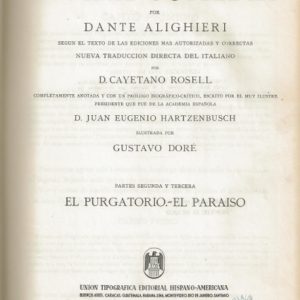 LA DIVINA COMEDIA POR DANTE ALIGHIERI. SEGUN EL TEXTO DE LAS EDICIONES MAS AUTORIZADAS Y CORRECTAS. NUEVA TRADUCCION DIRECTA DEL ITALIANO POR D. CAYETANO ROSELL. COMPLETAMENTE ANOTADA Y CON UN PROLOGO BIOGRAFICO-CRITICO, ESCRITO POR EL MUY ILUSTRE PRESIDENTE QUE FUE DE LA ACADEMIA ESPAÑOLA D. JUAN EUGENIO HARTZENBUCH. ILUSTRADA POR GUSTAVO DORE. PARTES SEGUNDA Y TERCERA. EL PURGATORIO Y EL PARAISO