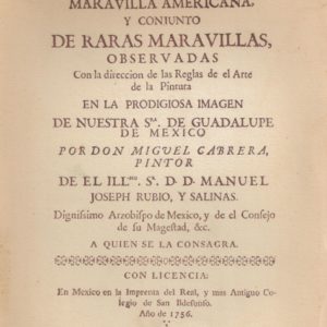 MARAVILLA AMERICANA, Y CONJUNTO DE RARAS MARAVILLAS, OBSERVADAS CON LA DIRECCION DE LAS REGLAS DE EL ARTE DE LA PINTURA EN LA PRODIGIOSA IMAGEN DE NUESTRA SRA. DE GUADALUPE DE MEXICO POR DON MIGUEL CABRERA, PINTOR. DE EL ILL-MO. SR. D. D. MANUEL JOSEPH RUBIO, Y SALINAS. DIGNISIMO ARZOBISPO DE MEXICO, Y DE EL CONSEJO DE SU MAGESTAD, &C. A QUIEN SE LA CONSAGRA.
