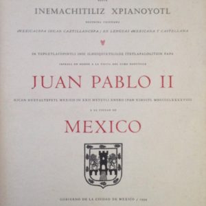 TEPITON BREVE INEMACHITILIZ XPIANOYOTL DOCTRINA CRISTIANA MEXICACOPA IHUAN CAXTILLANCOPA / EN LENGUAS MEXICANA Y CASTELLANA. IN TEPUZTLACOPINTLI INIC ILHUIQUIXTILILOZ ITETLAPALOLITZIN PAPA. IMPRESA EN HONOR A LA VISITA DEL SUMO PONTIFICE JUAN PABLO II. NICAN HUEYALTEPETL MEXICO IN XXII METZTLI ENERO IPAN XIHUITL MDCCCCLXXXXVIIII A LA CIUDAD DE MEXICO