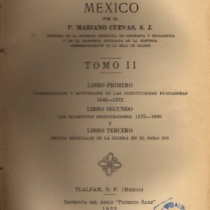 HISTORIA DE LA IGLESIA EN MEXICO TOMO II. LIBRO PRIMERO. CONSOLIDACION Y ACTIVIDADES DE LAS INSTITUCIONES FUNDADORAS 1548-1572. LIBRO SEGUNDO. LOS ELEMENTOS REGENERADORES. 1572-1600 Y. LIBRO TERCERO. FRUTOS ESPECIALES DE LA IGLESIA EN EL SIGLO XVII.