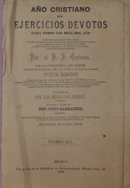 AÑO CRISTIANO. EJERSICIOS DEVOTOS PARA TODOS LOS DIAS DEL AÑO. CONTIENE LA EXPLICACION DEL MISTERIO O LA VIDA DEL SANTO DE CADA DIA, ALGUNAS REFLEXIONES SOBRE LA EPISTOLA Y UNA MEDITACION SOBRE EL EVANGELIO DE LA MISA Y AL ALGUNOS EJERCICIOS PRACTICOS DE DEVOCION O PROPOSITO PARA TODA CLASE DE PERSONAS. POR EL P. J. CROISSEL. TOMO III