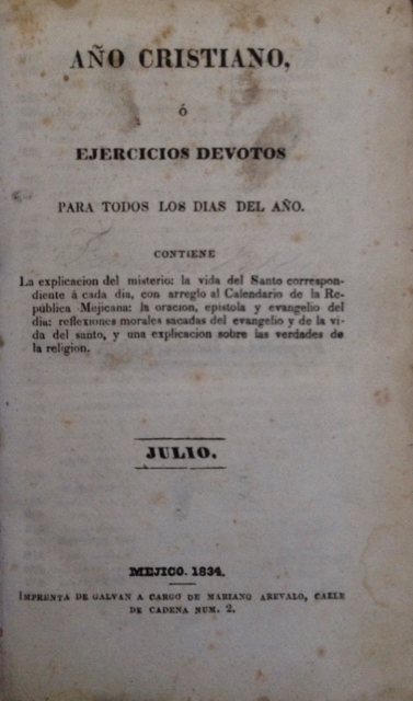 AÑO CRISTIANO, O EJERCICIOS DEVOTOS PARA TODOS LOS DIAS DEL AÑO. CONTIENE LA EXPLICACION DEL MISTERIO: LA VIDA DEL SANTO CORRESPONDIENTE A CADA DIA, CON ARREGLO AL CALENDARIO DE LA REPUBLICA MEJICANA: LA ORACION, EPISTOLA Y EVANGELIO DEL DIA: REFLEXIONES MORALES SACADAS DEL EVANGELIO Y DE LA VIDA DEL SANTO, Y UNA EXPLICACION SOBRE LAS VERDADES DE LA RELIGION. JULIO