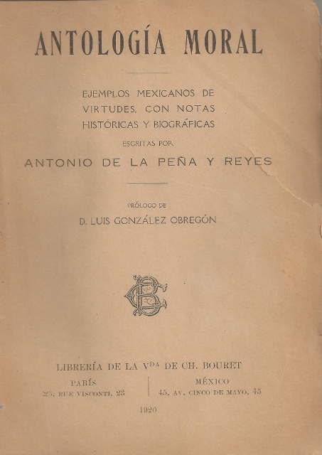 ANTOLOGIA MORAL. EJEMPLOS MEXICANOS DE VIRTUDES, CON NOTAS HISTORICAS Y BIOGRAFICAS
