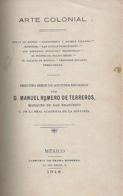AUTOR: ROMERO DE TERREROS (MANUEL)EDITOR: LIBRERIA DE PEDRO ROBREDOEDICIÓN: S. E.AÑO: 1918LUGAR: CIUDAD DE MEXICOPAÍS: MEXICOPÁGINAS: 218 PP.TEMARIO: ARTE DE MEXICOID: 4382.031