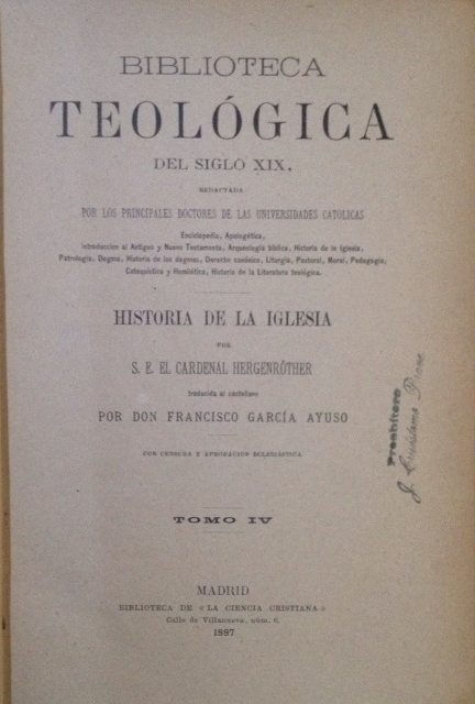 BIBLIOTECA TEOLOGICA DEL SIGLO XIX. HISTORIA DE LA IGLESIA. POR EL CARDENAL HERGENROTHER. TOMO IV