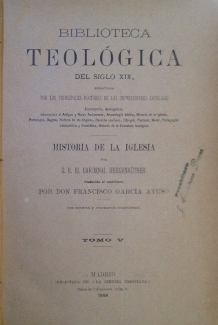 BIBLIOTECA TEOLOGICA DEL SIGLO XIX. HISTORIA DE LA IGLESIA. POR EL CARDENAL HERGENROTHER. TOMO V