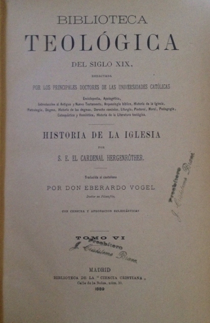 BIBLIOTECA TEOLOGICA DEL SIGLO XIX. HISTORIA DE LA IGLESIA. POR EL CARDENAL HERGENROTHER.TOMO VI
