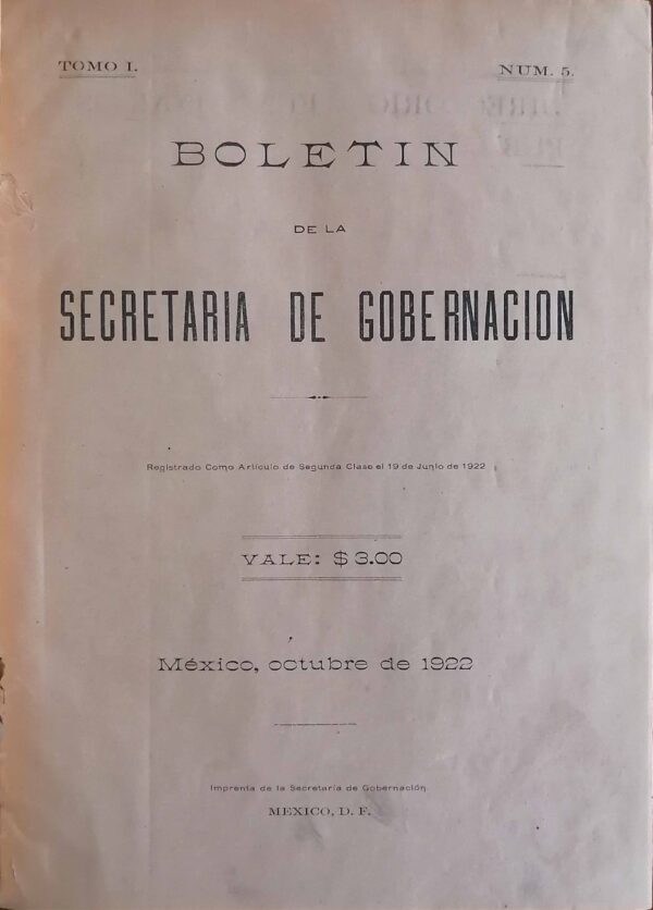 BOLETIN DE LA SECRETARIA DE GOBERNACION. TOMO I. NUMERO 5. OCTUBRE DE 1922.