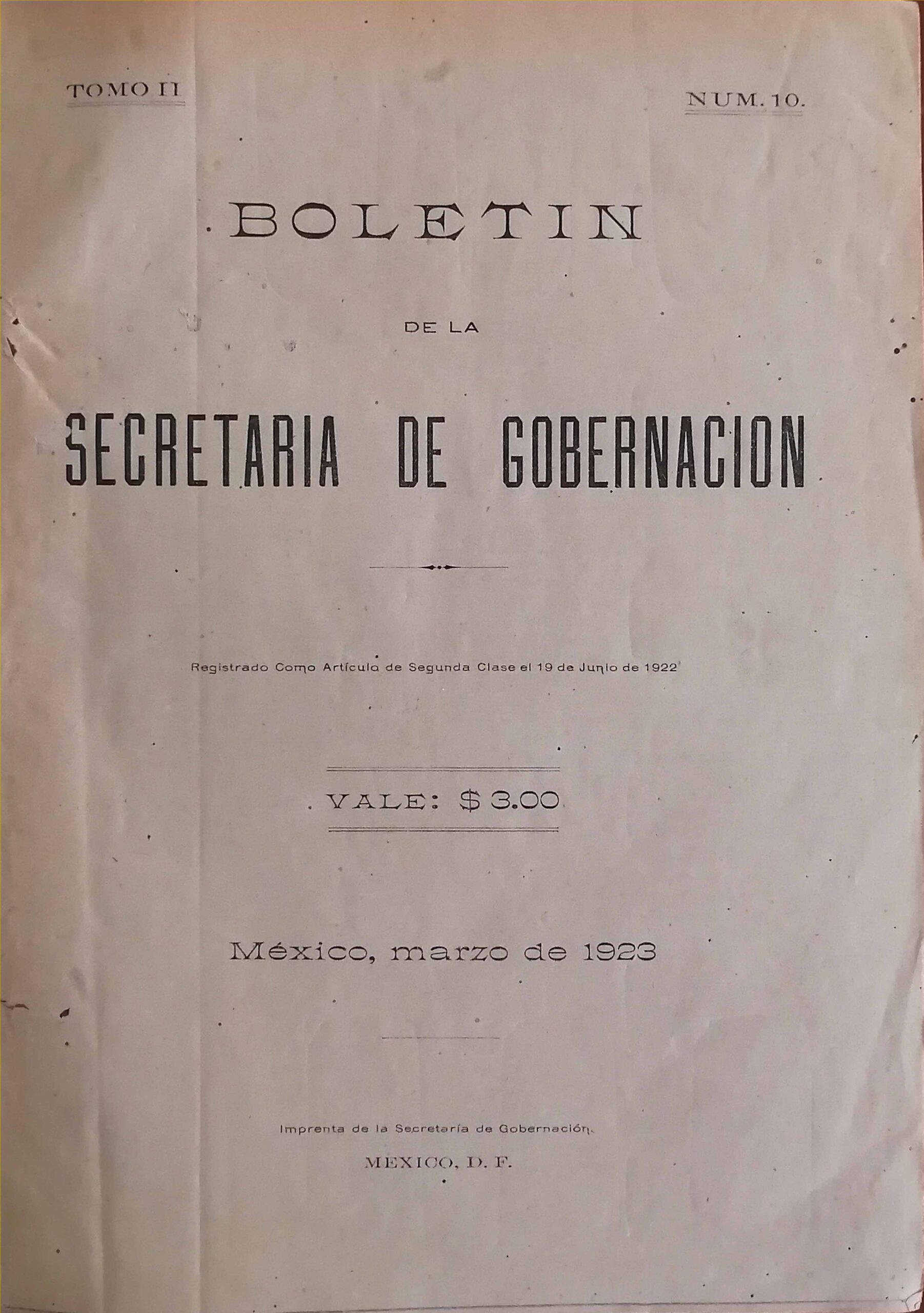 BOLETIN DE LA SECRETARIA DE GOBERNACION. TOMO II. NUMERO 10. MARZO DE 1923.