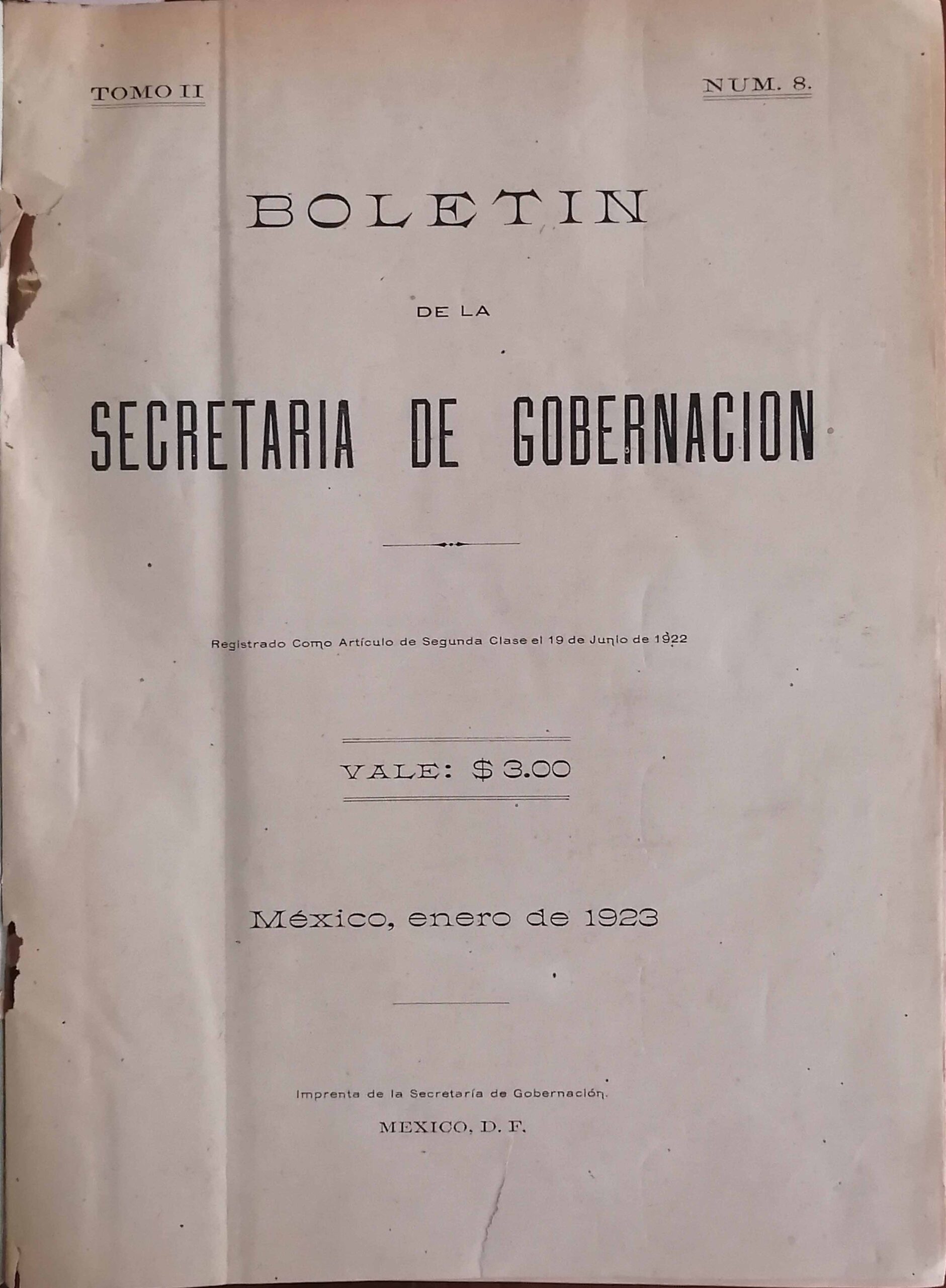 BOLETIN DE LA SECRETARIA DE GOBERNACION. TOMO II. NUMERO 8. ENERO DE 1923.