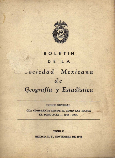 BOLETIN DE LA SOCIEDAD MEXICANA DE GEOGRAFIA Y ESTADISTICA. TOMO C. NOVIEMBRE DE 1971. INDICE GENERAL QUE COMPRENDE DESDE EL TOMO LXV HASTA EL TOMO XCIX- 1948 – 1964.