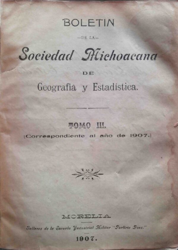 BOLETIN DE LA SOCIEDAD MICHOACANA DE GEOGRAFIA Y ESTADISTICA. TOMO III. CORRESPONDIENTE AL AÑO DE 1907. (NUMEROS: 1, 2, 3, 4, 5, 6, 7, 8, 9, 10, 11, 12, 13, 14, 15, 16, 17, 18, 19, 20, 21, 22, 23, 24)