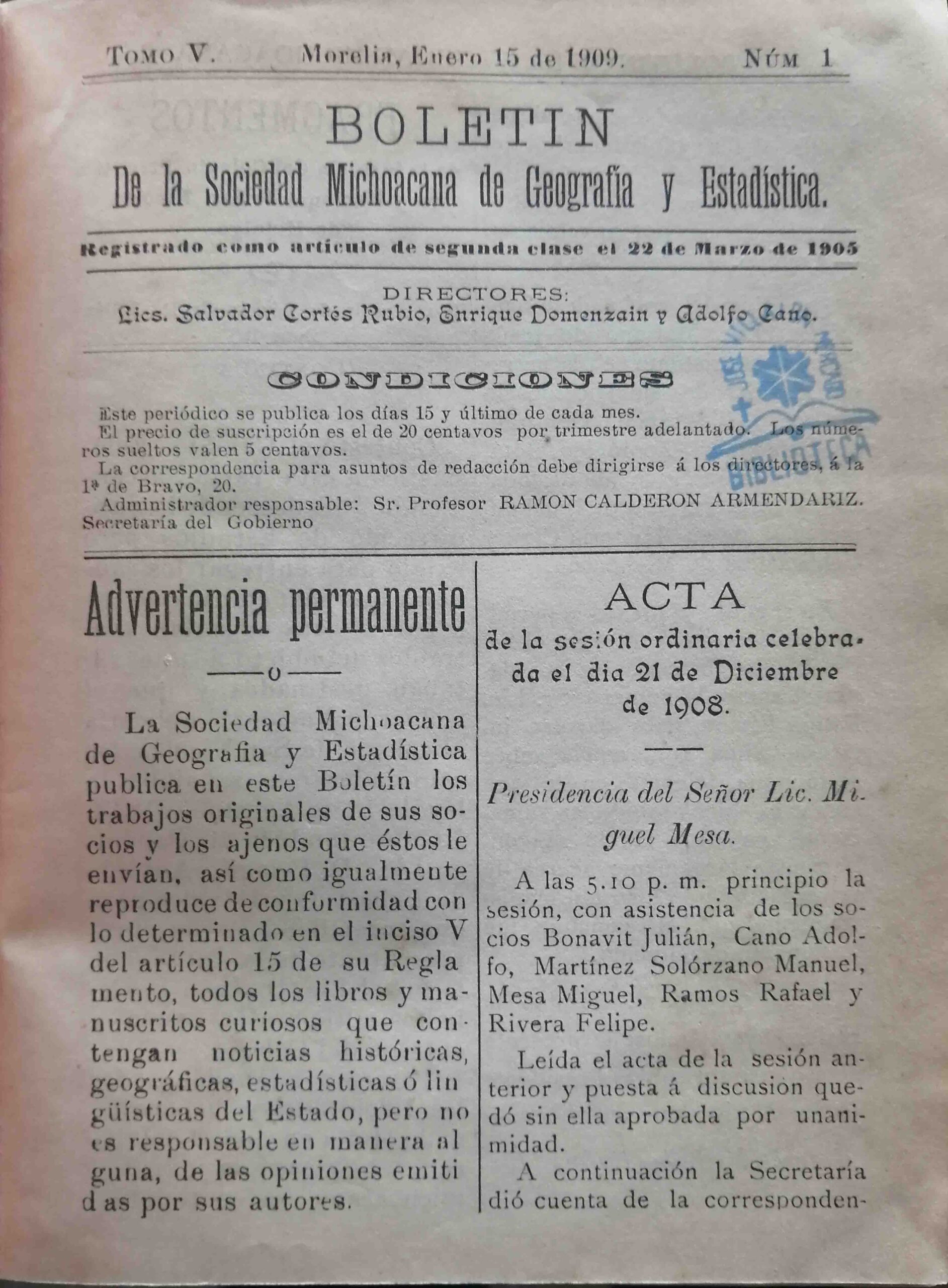 BOLETIN DE LA SOCIEDAD MICHOACANA DE GEOGRAFIA Y ESTADISTICA. TOMO V. CORREPONDIENTE AL AÑO 1909. (NUMEROS: 1, 2, 3, 4, 5, 6, 7, 8, 9, 10, 11, 12, 13, 14, 15, 16, 17)