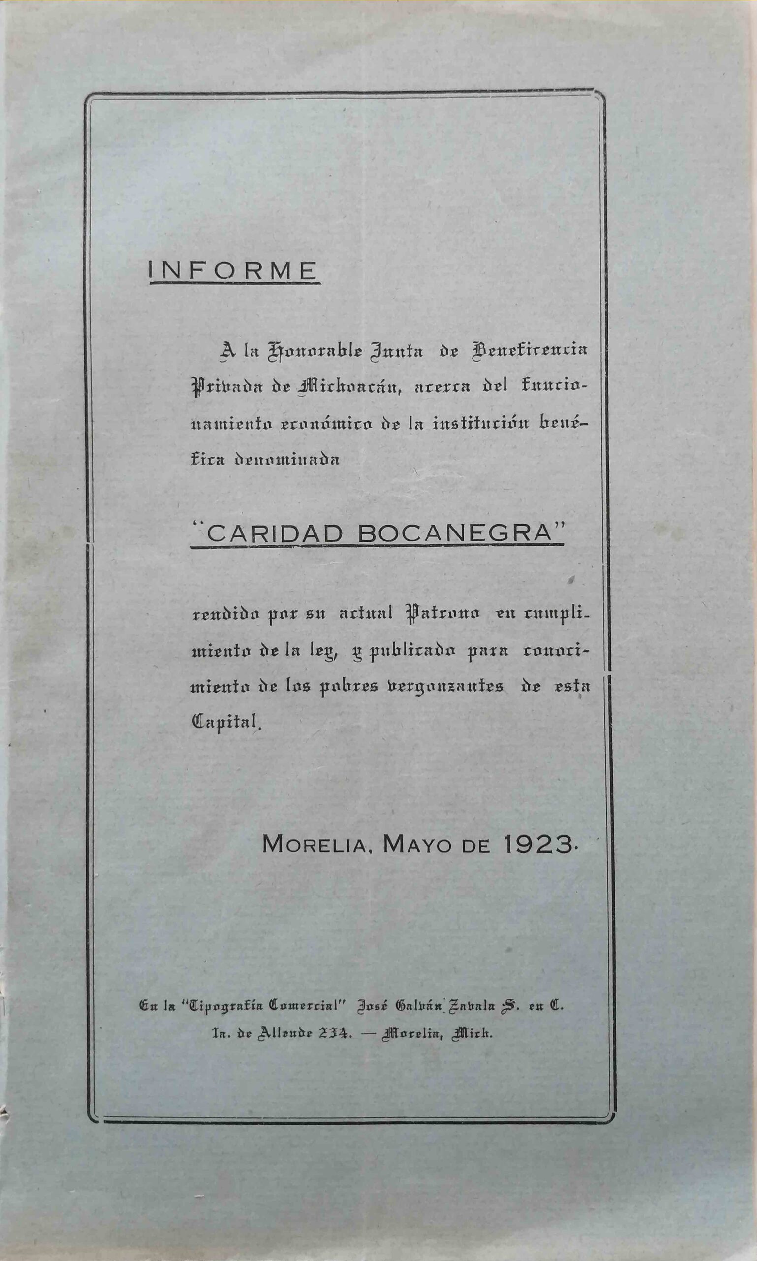 CARIDAD BOCANEGRA. A LA HONORABLE JUNTA DE BENEFICENCIA PRIVADA DE MICHOACAN, ACERCA DEL FUNCIONAMIENTO ECONOMICO DE LA INSTITUCION BENEFICA DENOMINADA CARIDAD BOCANEGRA