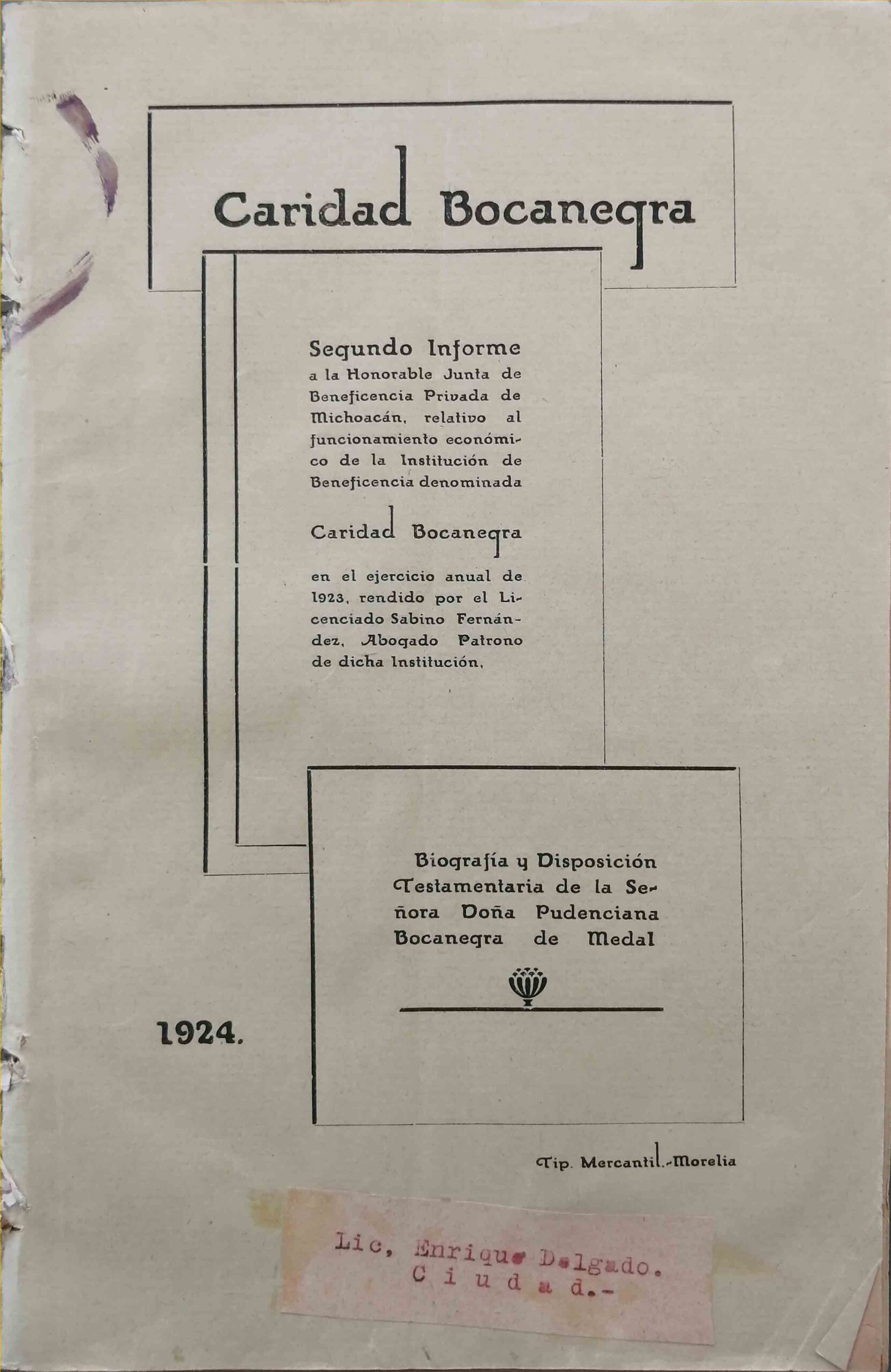CARIDAD BOCANEGRA. SEGUNDO INFORME A LA HONORABLE JUNTA DE BENEFICENCIA PRIVADA DE MICHOACAN, RELATIVO AL FUNCIONAMIENTO ECONOMICO DE LA INSTITUCION DE BENEFICENCIA DENOMINADA CARIDAD BOCANEGRA