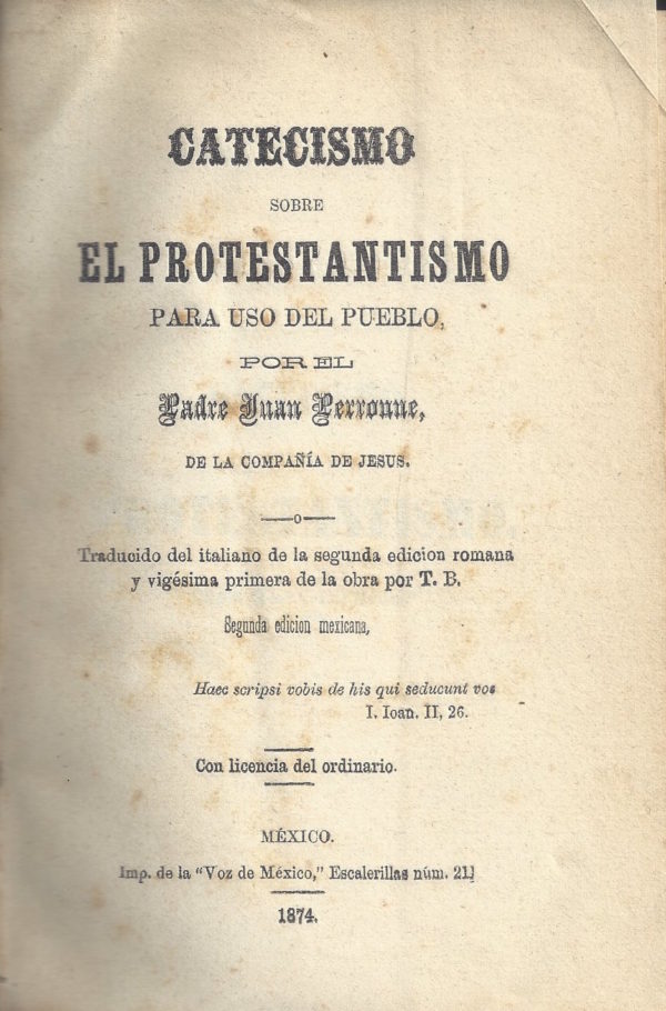 CATECISMO SOBRE EL PROTESTANTISMO PASA USO DEL PUEBLO, POR EL PADRE JUAN PERRONNE, DE LA COMPAÑIA DE JESUS