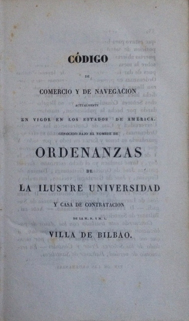 CODIGO DE COMERCIO Y DE NAVEGACION ACTUALMENTE EN VIGOR EN LOS ESTADOS DE AMERICA. CONOCIDO BAJO EL NOMBRE DE ORDENANZAS DE LA ILUSTRE UNIVERSIDAD Y CASA DE CONTRATACION DE LA M. N. Y M. I. VILLA DE BILBAO