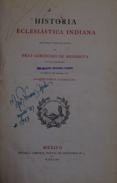 COLECCION DE DOCUMENTOS PARA LA HISTORIA DE MEXICO. TOMO TERCERO. HISTORIA ECLESIASTICA INDIANA. OBRA ESCRITA A FINES DEL SIGLO XVI POR FRAY GERONIMO DE MENDIETA DE LA ORDEN DE SAN FRANCISCO. PUBLICADA POR PRIMERA VEZ JOAQUIN GARCIA ICAZBALCETA