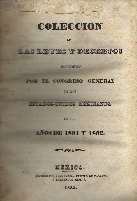 COLECCION DE LAS LEYES Y DECRETOS ESPEDIDOS POR EL CONGRESO GENERAL DE LOS ESTADOS UNIDOS MEXICANOS EN LOS AÑOS DE 1831 Y 1832. (TOMO VI)