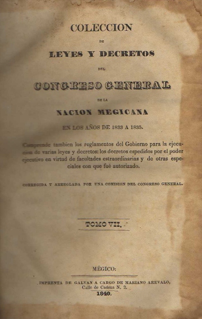 COLECCION DE LEYES Y DECRETOS DEL CONGRESO GENERAL DE LA NACION MEXICANA EN LOS AÑOS DE 1833 A 1835. TOMO VII