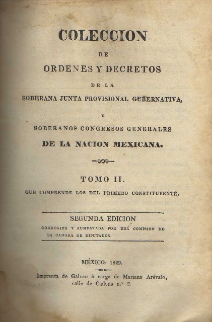 COLECCION DE ORDENES Y DECRETOS DE LA SOBERANA JUNTA PROVISIONAL GUBERNATIVA, Y SOBERANOS CONGRESOS GENERALES DE LA NACION MEXICANA. TOMO II. QUE COMPRENDE LOS DEL PRIMERO CONSTITUYENTE