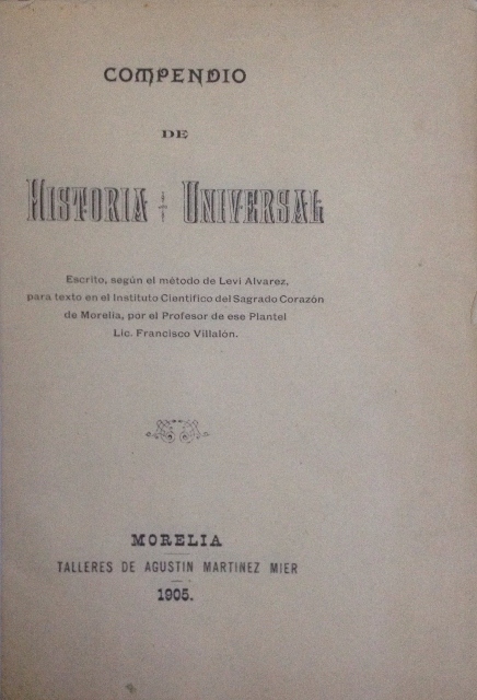 COMPENDIO DE HISTORIA UNIVERSAL ESCRITO, SEGUN EL METODO DE LEVI ALVAREZ, PARA TEXTO EN EL INSTITUTO CIENTIFICO DEL SAGRADO CORAZON DE MORELIA, POR EL PROFESOR DE ESE PLANTEL LIC. FRANCISCO VILLALON