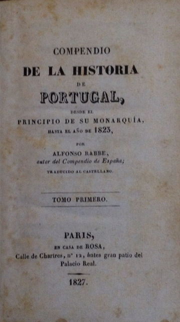 COMPENDIO DE LA HISTORIA DE PORTUGAL, DESDE EL PRINCIPIO DE SU MONARQUIA, HASTA EL AÑO DE 1823, POR ALFONSO RABBE. TOMO PRIMERO. TRADUCIDA AL CASTELLANO