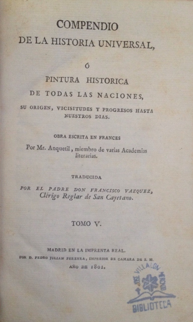 COMPENDIO DE LA HISTORIA UNIVERSAL, O PINTURA HISTORICA DE TODAS LAS NACIONES, SU ORIGEN, VICISITUDES Y PROGRESOS HASTA NUESTROS DIAS. TOMO V
