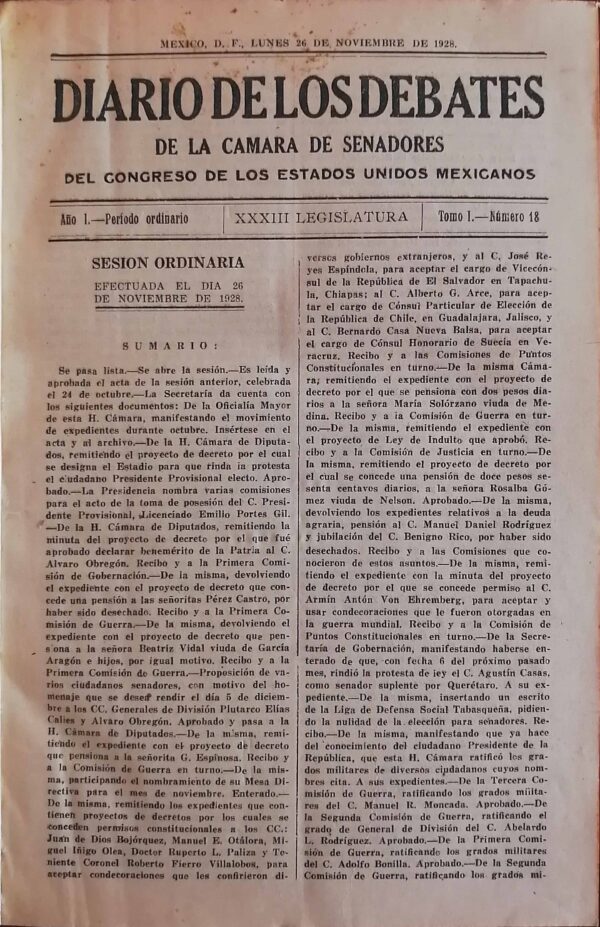 DIARIO DE LOS DEBATES DE LA CAMARA DE DIPUTADOS DEL CONGRESO DE LOS ESTADOS UNIDOS MEXICANOS. TOMO I. AÑO I. 26 DE NOVIEMBRE DE 1928. No. 18 AL 34. 29 DE NOVIEMBRE DE 1929. AÑO II. TOMO V.