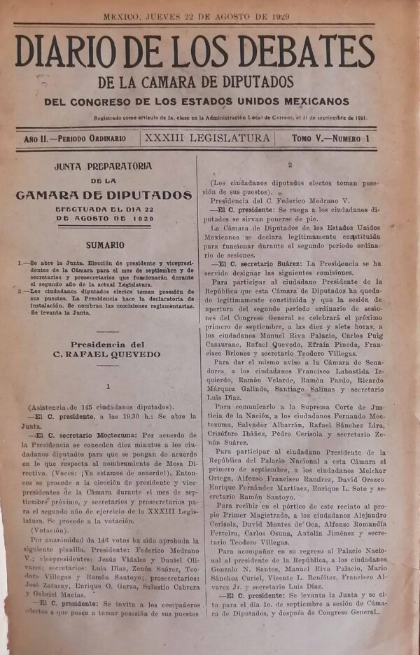 DIARIO DE LOS DEBATES DE LA CAMARA DE DIPUTADOS DEL CONGRESO DE LOS ESTADOS UNIDOS MEXICANOS. TOMO V. 22 DE AGOSTO DE 1929. 1 AL 43. 30 DE DICIEMBRE DE 1929. TOMO V.
