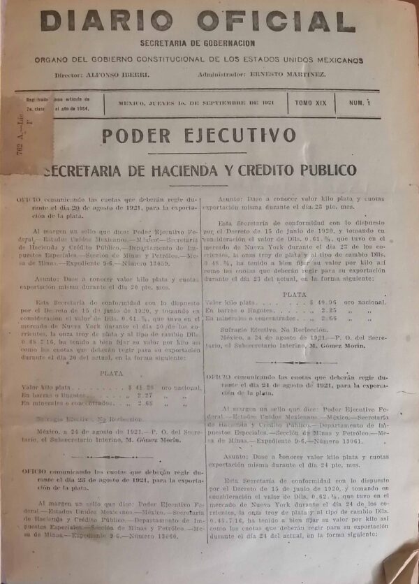 DIARIO OFICIAL. SECRETARIA DE GOBERNACION ORGANO DEL GOBIERNO CONSTITUCIONAL DE LOS ESTADOS UNIDOS MEXICANOS. TOMO XIX. 1 DE SEPTIEMBRE DE 1921. No. 1 AL 49. 31 DE OCTUBRE DE 1921. TOMO XIX.
