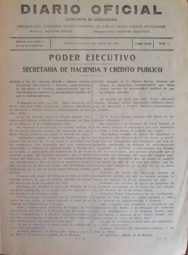 DIARIO OFICIAL. SECRETARIA DE GOBERNACION ORGANO DEL GOBIERNO CONSTITUCIONAL DE LOS ESTADOS UNIDOS MEXICANOS. TOMO XVIII. 2 DE MAYO DE 1921. No. 1 AL 51. 30 DE JUNIO DE 1921. TOMO XVIII.